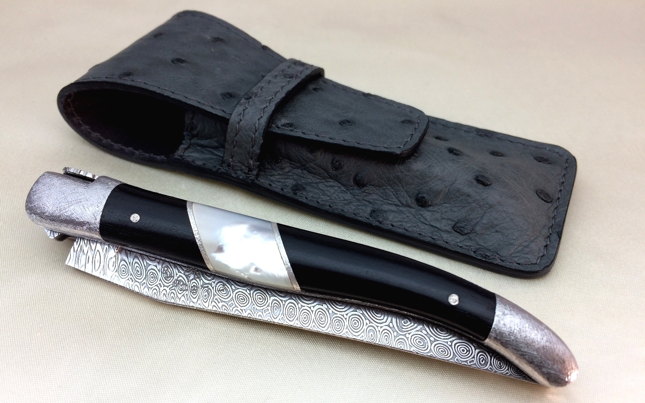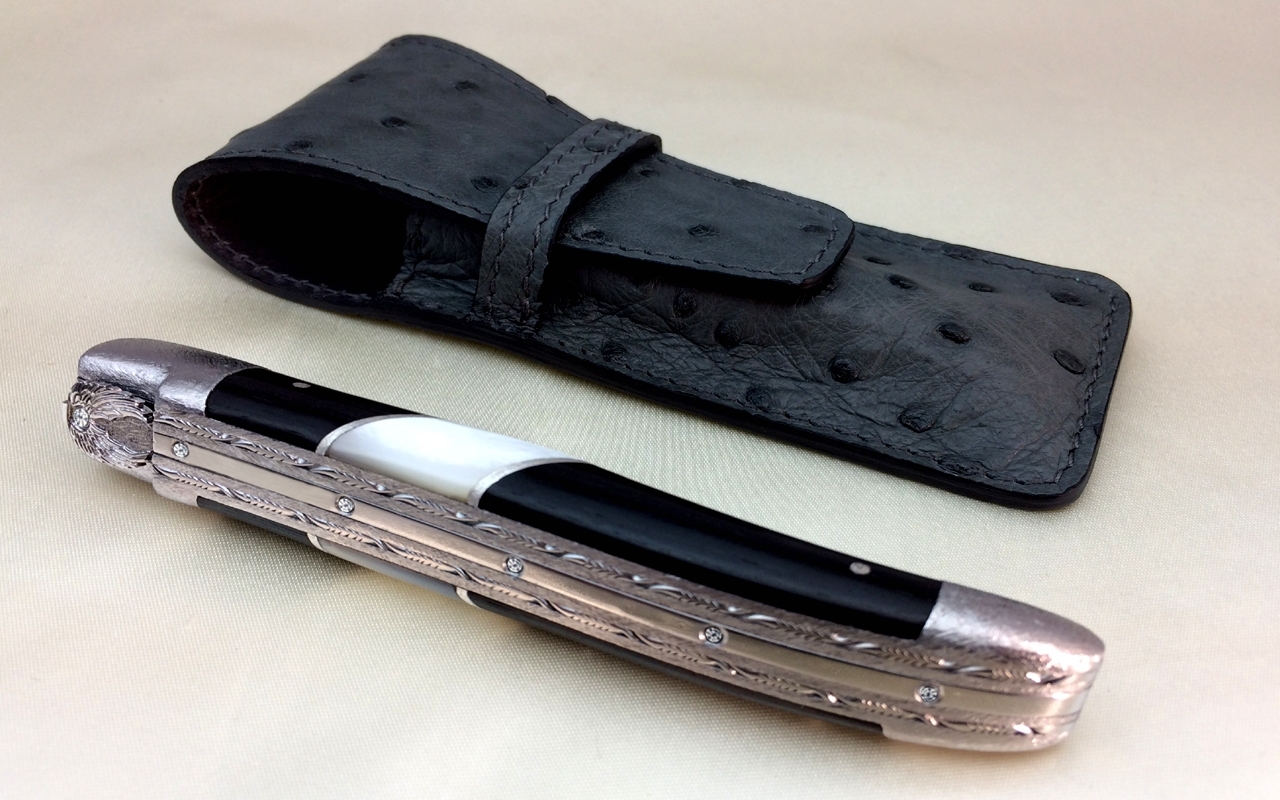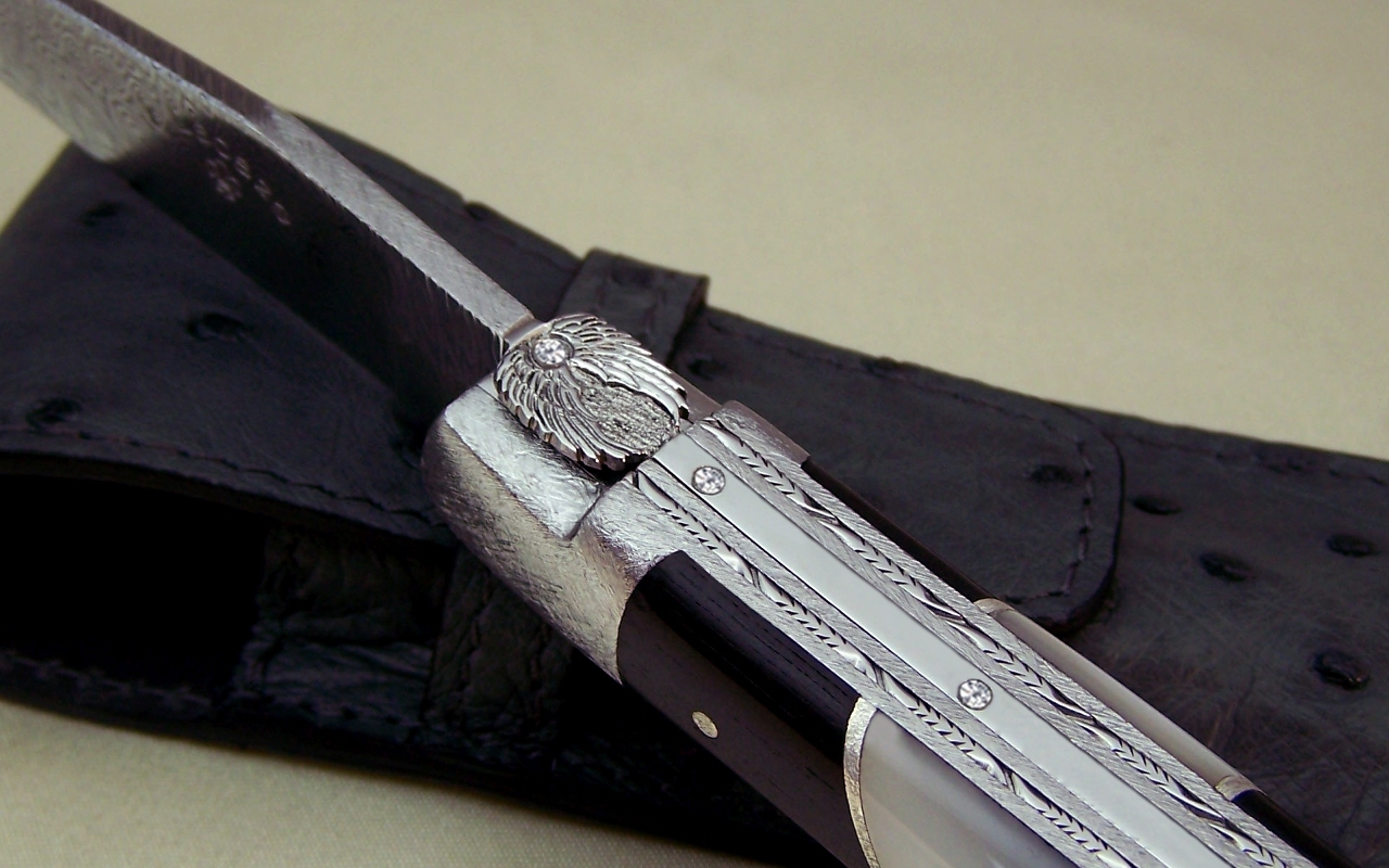 (VENDU) Couteau Laguiole haut de gamme, son manche reçoit un ressort forgée avec des ailes d'anges ciselées sertie de 6 diamants. Il est monté en triples platines avec la centrale ciselée de fines feuilles sur le dessus et de liane sur le dessous. Son manche est façonné dans du bois d'ébène naturel avec un cloisonnage en argent massif 925 et insert en nacre perlière blanche.Les ailes d'anges...Les anges sont invisibles, ce sont des formes spirituelles, des esprits, des Intelligences, si on leur a donné des ailes, c'est parce que le vol est le plus parfait et le plus noble d'entre les mouvements locaux de l'animal, ce qui permet de s'approcher et de s'éloigner en un clin d'œil.Dans la Bible hébraïque, les anges sont des messagers qui originairement effectuent des tâches bonnes ou mauvaises, certains sont créés à un moment donné à partir de subtils éléments de matière comme l'air et le feu, d'autres sont éternelsLe Diamant... Chez les bouddhistes, le diamant symbolise la puissance spirituelle et l’on dit qu’il est éternel comme la vérité. Cette pierre précieuse est l'emblème de l’amour sincère, de la pureté, du pouvoir et du courage. Sa rareté font du diamant une gemme dont rêvent toutes les femmes...Le couteau est accompagné d'un bel étuis luxe en cuir d'autruche naturel de teinte grise de chez Max. Ce couteau est confectionné dans mon atelier, signé LACAZE pour garantir un savoir faire de qualité. Information TechniqueLAMELongueur: 100 mm Largeur: 18 mm Epaisseur: 3 mm T° de trempe: 1100° Revenu: 2 Heures a 200°Dureté aprés revenu: 62 HRCType: DAMAS RWL motif RoseAcier inox a haute tenue de coupe issue de la métalurgie des poudres. Cette lame est réalisée à la main avec une émouture en creux.MANCHELongeur: 120 mmLargeur: 22 mmPlatines: Inox 316Mitres: inox diamanté Ebène naturel noir avec cloisonnage en argent massif 925 et nacre d'huitre perlière, triple platines dont la centrale est ciselée par des feuilles de fougères sur le dessus et le dessous.RESSORTLongueur:120 mmEpaisseur: 3 mmAbeille: Ailes d'ange ciselé main au burinDiamants: 0.40 carat EF VVS taille brillant