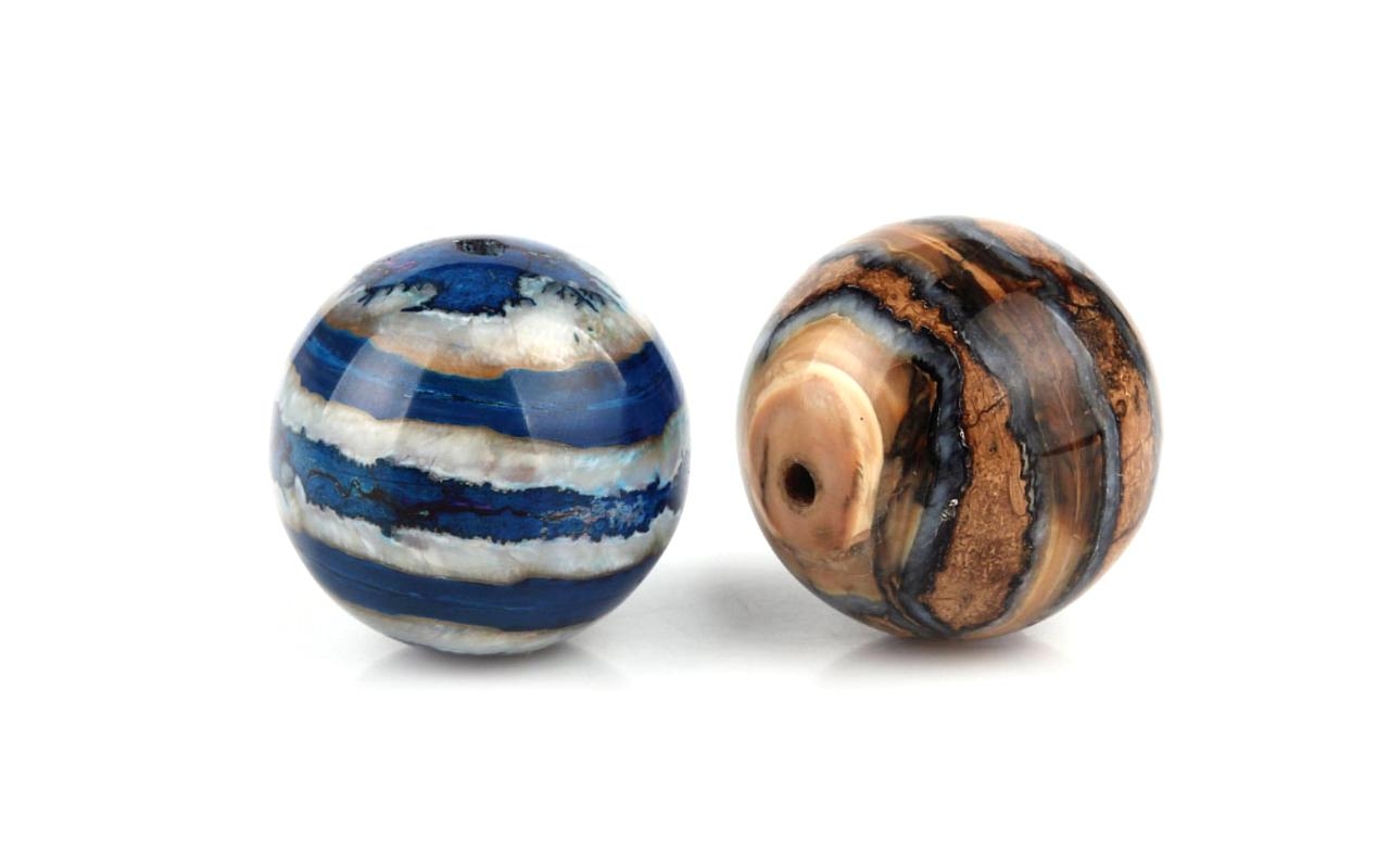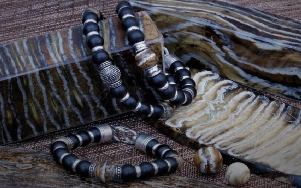 Les perles en Damas titane ou en acier damas forgé, les perles de 6 à 12 mm en argent massif 925, les perles en os fossile de dinosaure, les perles en ivoire et molaire de mammouth.